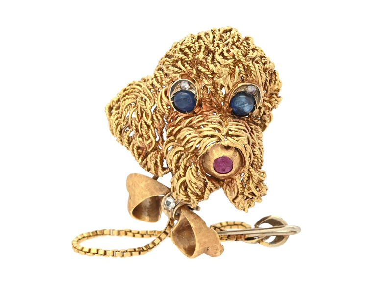 BROOCH, dog, 18K gold, ruby, sapphires, Italy, measurements 37x30 mm, weight 18,6 g, safety chain, notches.