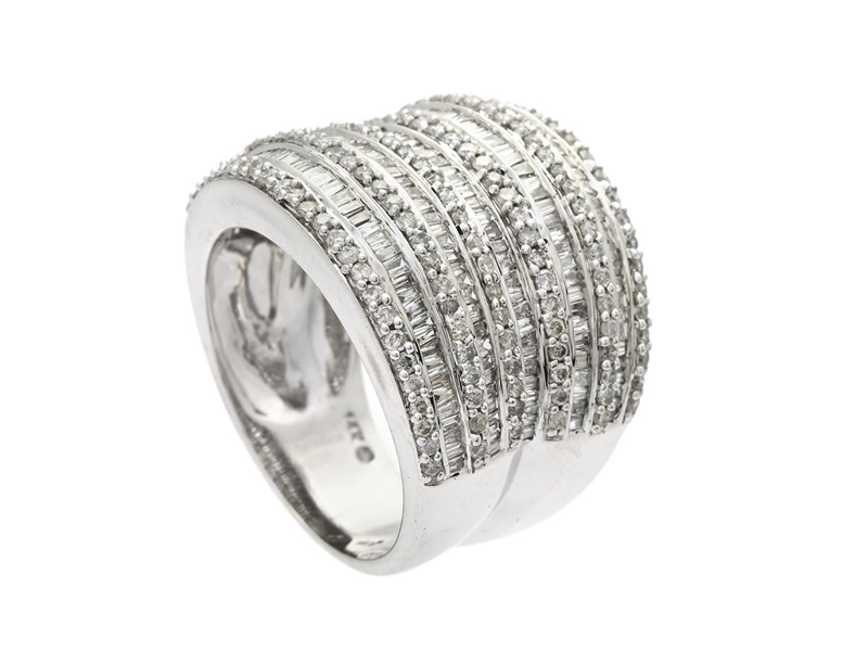 RING, 14K rhodium plated gold, approx. 145 brilliant cut and 195 baguette cut diamonds approx. 1,40 ctw, approx. Cr-TCa/SI-P1, size 17,75 mm, weight 9,5 g.