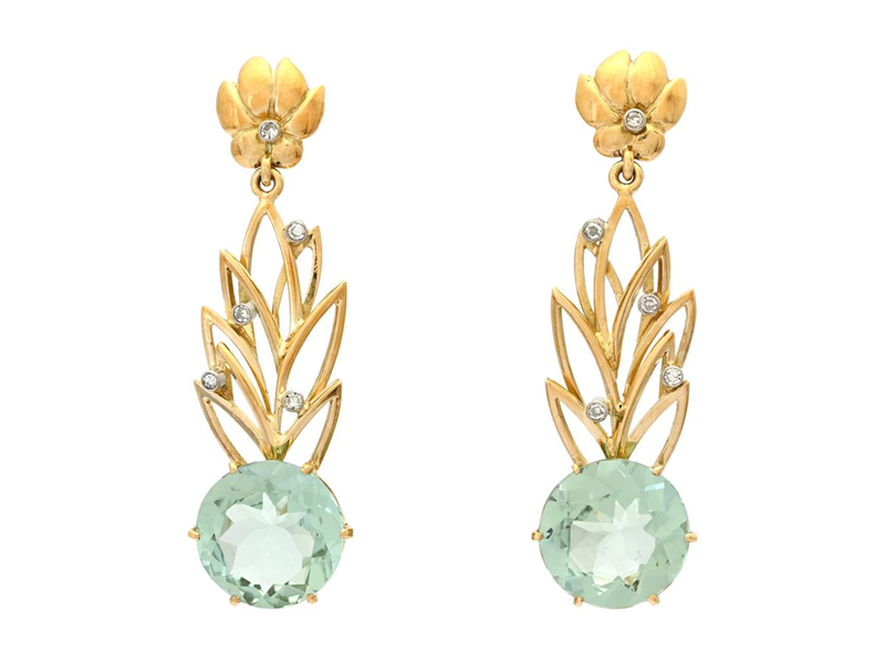 C.F.CARLMAN, earrings, 18K gold, green tourmalines approx. 6,40 ctw, single cut diamonds, height 3,8 cm, Stockholm 1960, weight 7,2 g, pushback, original box, one push back missing.