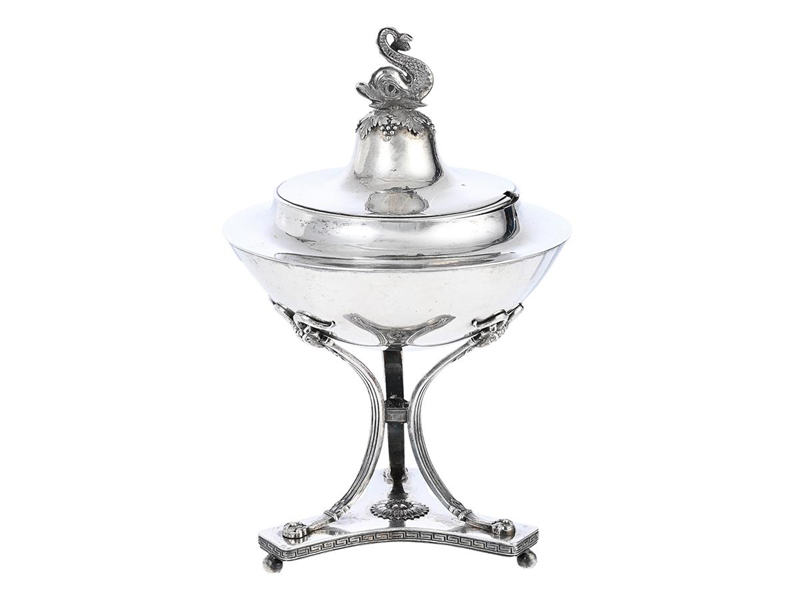 JOHAN PETTER GRÖNVALL, bonbonnière, silver, Empire style, knob in the shape of a dolphin, decoration featuring vine leaves, a mascaron, ram’s heads, fluted legs, meander border and ball feet, Stockholm 1820, weight 580,2 g.