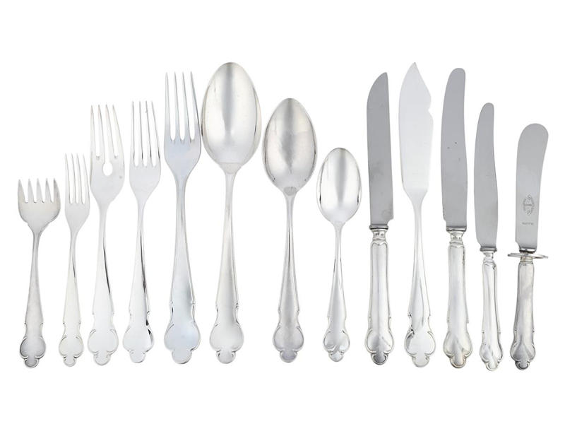 TABLEWARE, 85 pcs, Disa, silver, 12 tableforks, 12 tableknives, 3 tablespoons, 6 table spoons, 6 table knives, 6 table forks, 12 starter forks, 6 fish forks, 6 fish knives, 1 table knife, 2 butter knifes, 12 teaspoons, 1 serving fork, designed of Linus Holst, manufactured of Markströms Guldsmeds Ab K G, 1969, weight 3330 g.