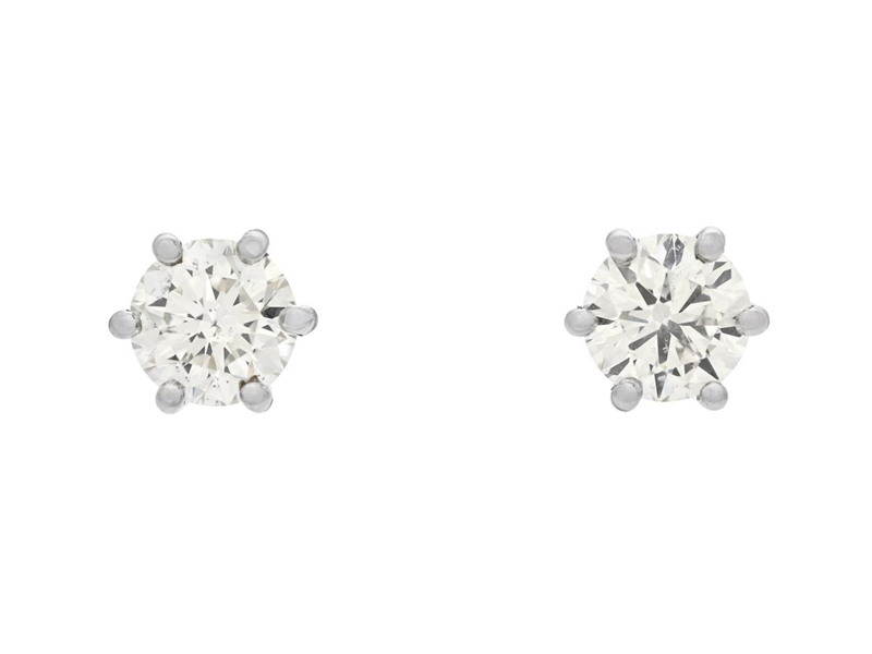 SOLITAIRE EARRINGS, 18K white gold, brilliant cut diamonds 1,01 ctw, TW(F)/SI2, weight 2,0 g, pushback, one of the diamonds has small notch on the culet.