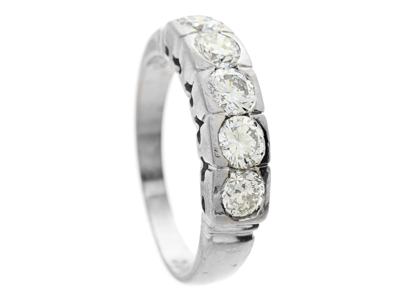 RING, 18K white gold, 5 brilliant cut diamonds approx. 1,00 ctw, approx. TW-W/VS-SI, size 17,25 mm, weight 5,7 g, in need of rhodium, skew ringshank, one diamond with notch.