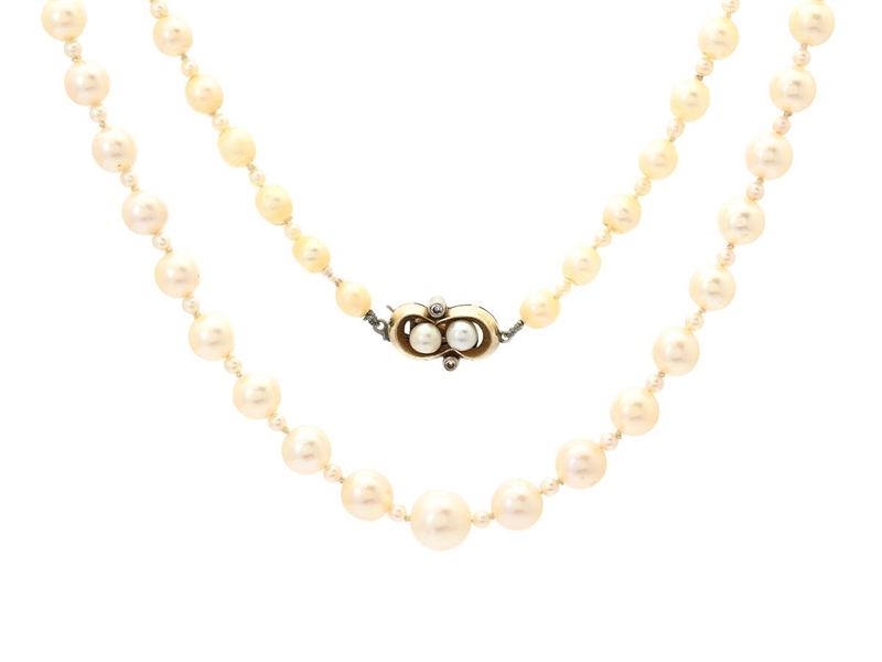 PEARL NECKLACE, cultured pearls approx. 5.5 - 9.5 mm, interspersed oriental pearls, clasp 18K gold pearl, brilliant cut diamonds approx. 0.02 ctw, length 58 cm, signs of wear.