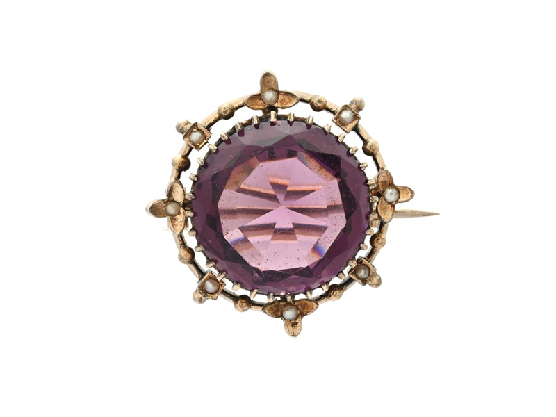 BROOCH, gilt silver, amethyst, oriental pearls, measurements 23 x 23 mm, weight 7,7 g