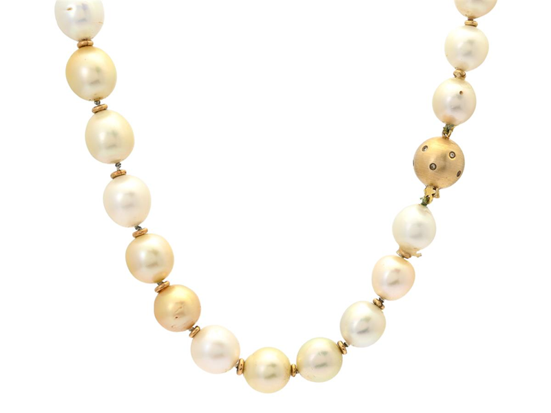 PÄRLCOLLIER,cm Pearl necklace, white and yellow somewhat off-round south-sea pearls approx. 11- 12,8 mm, length approx. 46 cm, round clasp in 18K gold with some small diamonds, small rings in 18K gold, weight 86,5 g.