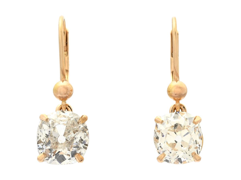 SOLITAIRE EARRINGS, 18K gold, antique cut diamonds, approx. 3,36 ctw, (ca1,76 ct & 1,60 ct), approx. W-Cr(H-J)/SI2-P2 ), weight 3,6 g, hooks with stop, diamonds has notches and damages on the girdles.