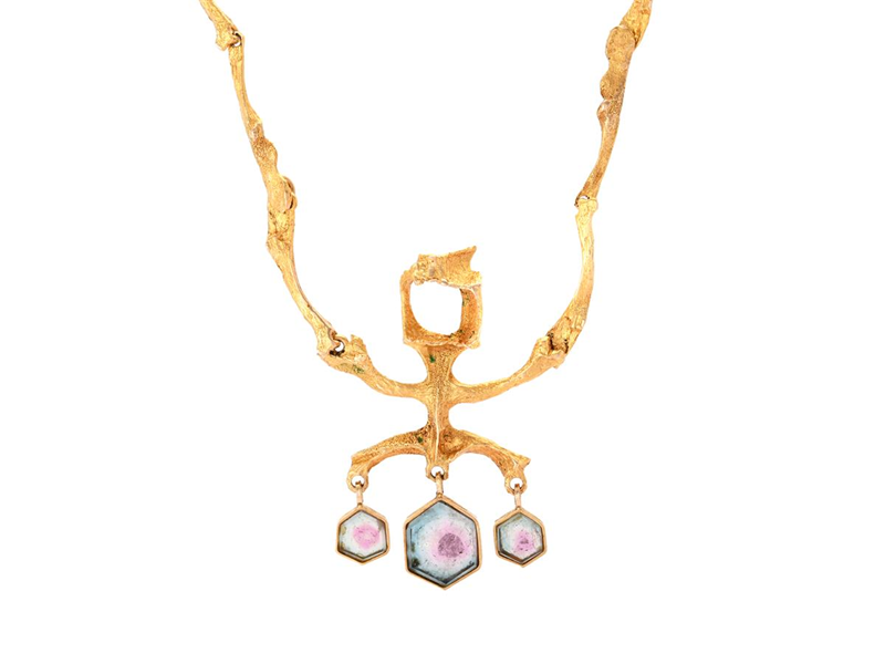 LAPPONIA, necklace, 14K gold, Lucifer, Björn Weckström, watermelon tourmalines, Helsingfors 1972, length 47 cm, weight 28,6 g.