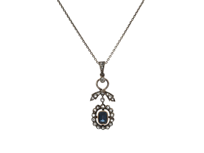 PENDANT WITH CHAIN, silver/18K gold, cushion cut sapphire approx. 0,60 ct, rose cut diamonds, antique, Gustaf Dahlgren & Co, Malmö 1917, height 30 mm, length 38,5 cm, weight 3,4 g, the sapphire has notches on the culet.