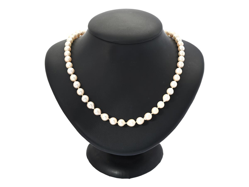 PEARL NECKLACE, cultured pearls approx. 7,7,5 mm, clasp in 18K gold/white gold, 4 single cut diamonds approx. 0,04 ctw, length 46 cm, weight 30,4 g.
