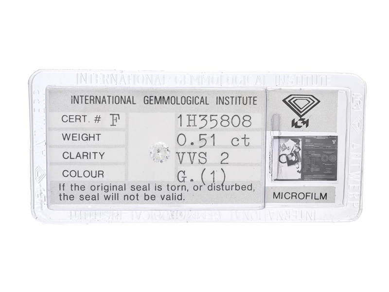 DIAMOND, brilliant cut, 0,51 ct, TW(G)VVS2, IGI Diamond Certifikat F1H35808, sealed.