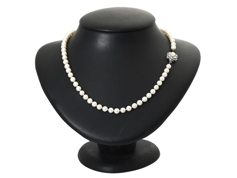 PEARL NECKLACE, cultured salt water pearls approx. 5,0-5,5 mm, clasp in silver with paste and cultured pearl, length 63,5 cm, weight 22,7 g.
