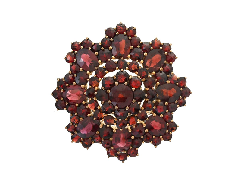 BROOCH, white metal, garnets, diameter 36 mm, weight 7,8 g, a few garnets has notches and small damages.