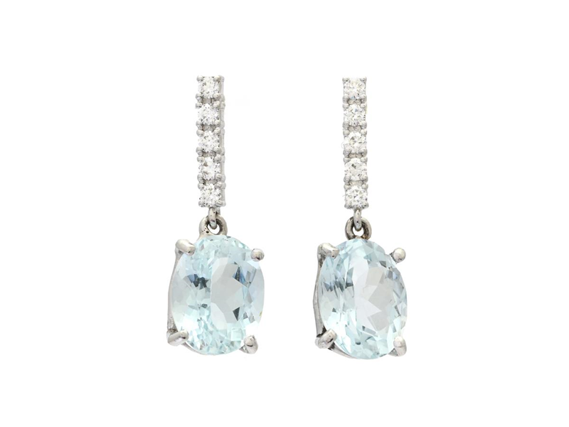 EARRINGS, 18K white gold, 2 oval cut aquamarines approx. 5,70 ctw, 10 brilliant cut diamonds approx. 0,25 ctw, approx. TW-W/VS-SI, height 28 mm, weight 3,8 g, pushback.