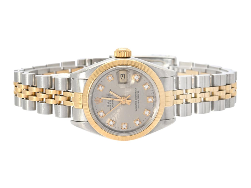 ROLEX, Oyster Perpetual, Datejust (T Swiss Made T), Chronometer, Ref no. 69173, Serial no. N100235, Cal 2135, Movement no. 1882044, Case no. 69000A, ladies´ wristwatch, 26 mm, steel/gold, self winding, sapphire crystal (damaded), date, diamond dial (10 pcs. 8/8), Jubilee bracelet (see picture), folding clasp, Ref no. 62523D.18-P1/468 B, approx. 1991, box.