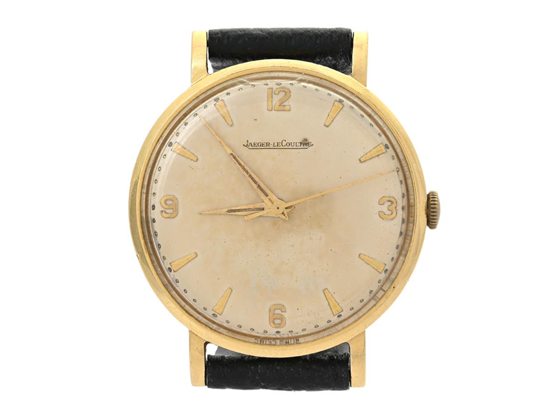 JAEGER-LE COULTRE, men´s wristwatch, 35 mm, Cal P478/C, Serial no. 1268228, Case no. 567298 A, 18K gold, manual winding, plastic crystal, damaged dial, engraving, leather strap, approx. 1957.