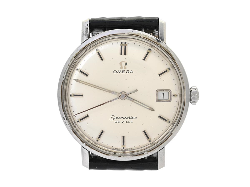 OMEGA, Seamaster, De Ville (Swiss Made T), Cal 611, Serial no. 21684700, Ref no. ST 136.020, Case no. 136.020, men´s wristwatch, 34,5 mm, steel, manual winding, plastic crystal, date, damaged dial/hands, leather strap, approx. 1964.