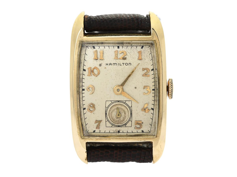 HAMILTON, men´s wristwatch, 23 x 27 (37,5) mm, Cal 754, Serial no. 6234H, Case no. R243385, 14K gold, manual winding, plastic crystal, small seconds hand, damaged dial, barrel shaped movement, leather strap, approx. 1952.