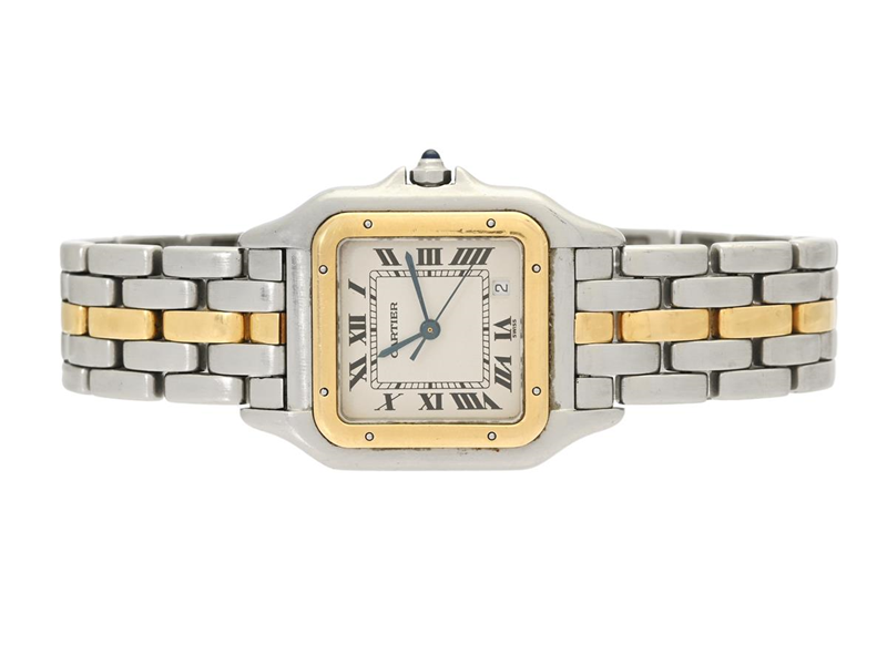 CARTIER, Panthère, Cal 83, Case no. 83949017676, unisex, 26,5 x 26,5 (36) mm, steel/gold, quartz, sapphire crystal, date, damaged dial, original bracelet (1-row), folding clasp, approx. 1988, box (not complete).