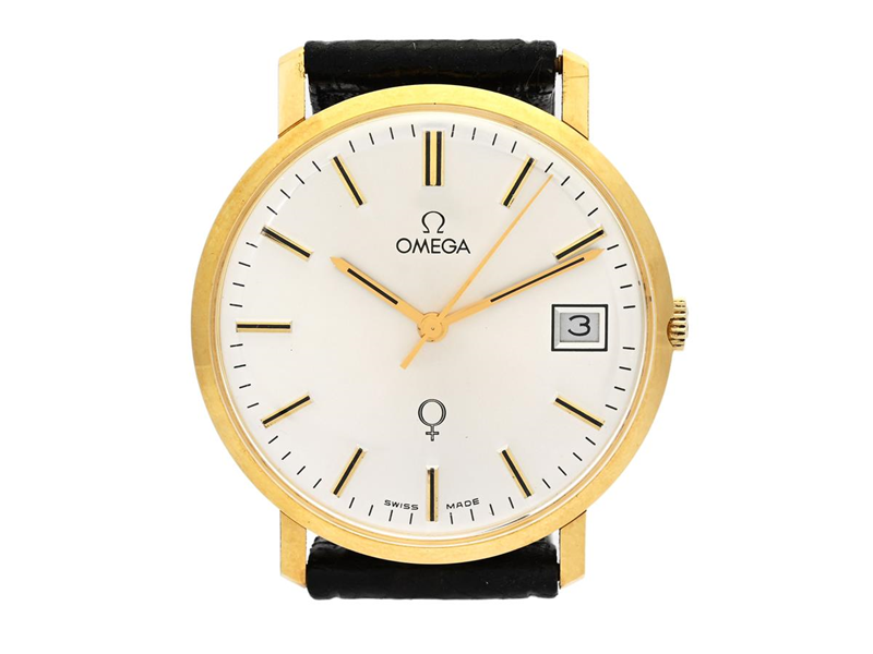 OMEGA, Genève, Cal 1030, Serial no. 35759078, Ref no. BA 132.9051, Case no. 132.9051/1181, men´s wristwatch, 34 mm, 18K gold, manual winding, plastic crystal, date, logo on dial, engraving, leather strap, gold plated original buckle, approx. 1972, box (damaged).