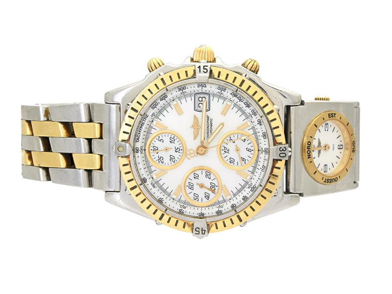 BREITLING, Chronomat, Chronometre, "Tachymetre", Cal 13 (ETA 7750), Movement no. 19908, Serial no. 27415, Ref no. D13350, chronograph, men´s wristwatch, 40,5 mm, steel/gold, self winding, sapphire crystal, date, MOP, defect, UTC, Serial no. 3402, Ref no. B61172, bicolour, quartz, MOP, defect, Pilot bracelet (steel/gold), folding clasp, Ref no. S1098/302D, approx. 1998, box (damaged), paper box.