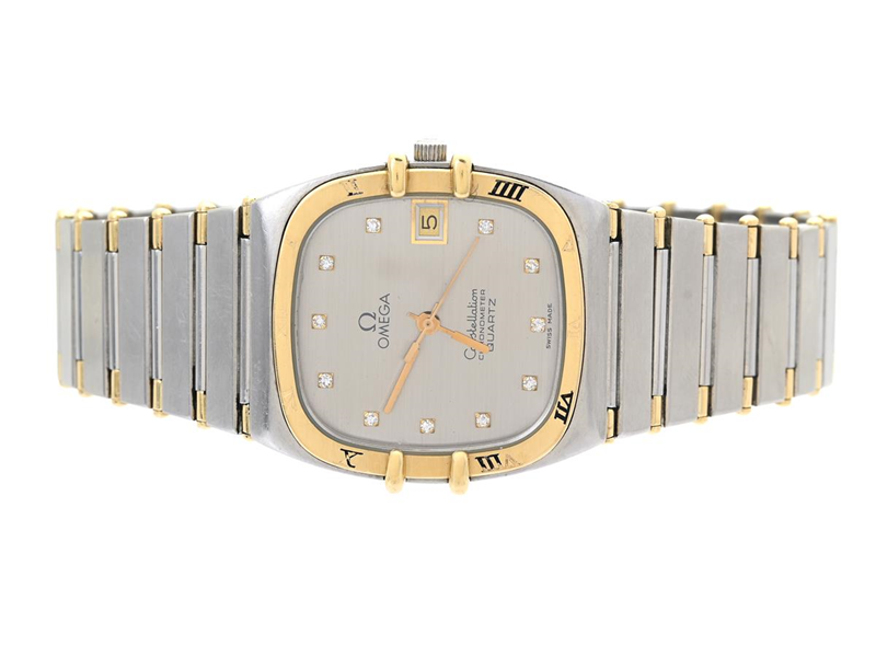 OMEGA, Constellation, Chronometer, Cal 1431, Movement no. 47103606, Serial no. serial number i indian ink not bevarat, Ref no. DR 398.0877, Case no. 398.0877/198.0141/398.0867, men´s wristwatch, 30 mm, steel/gold, quartz, sapphire crystal, date, diamonds on dial (11 pcs. 8/8), integrated original bracelet, folding clasp, Ref no. 1392/084, approx. 1986.
