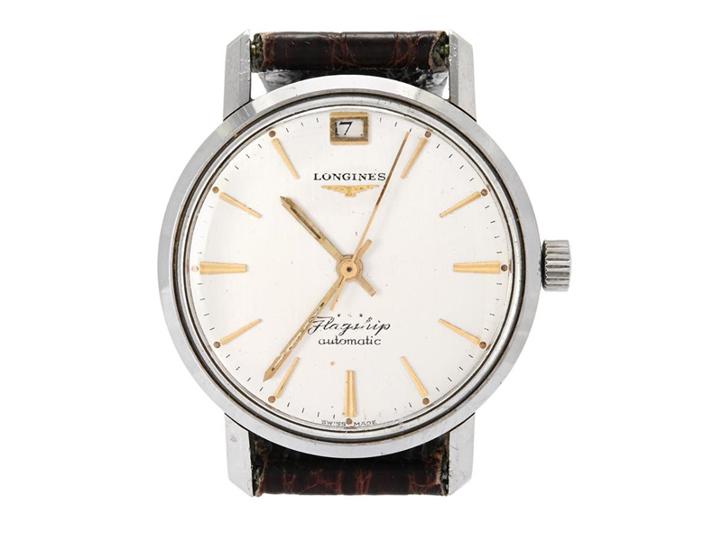 LONGINES, Flagship, Cal 341, Serial no. 11586722, Case no. 3108-1 / 707, men´s wristwatch, 35 mm, steel, self winding, plastic crystal, date, damaged dial/hands, leather strap, approx. 1960.