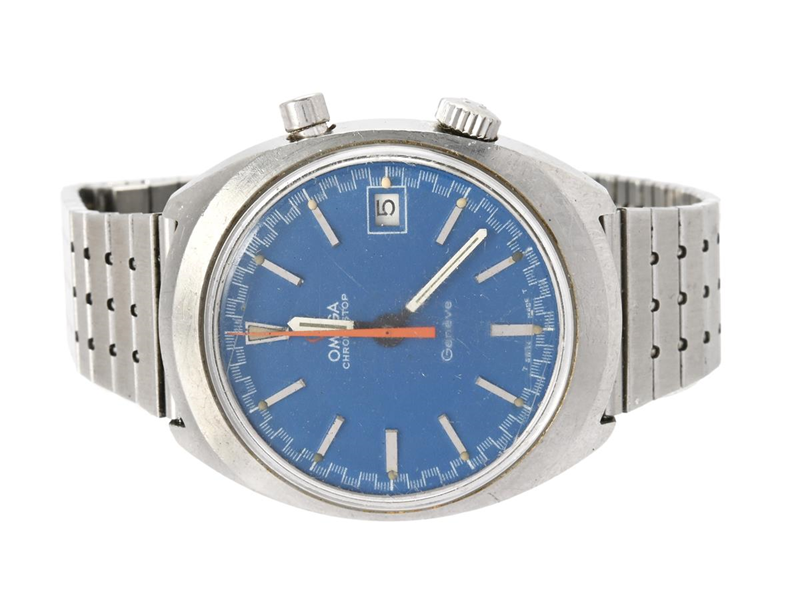OMEGA, Genève, Chronostop (T Swiss Made T), Cal 920, Serial no. 28852249, Ref no. ST 146.009, Case no. 146.009/146.010, chronograph, men´s wristwatch, 35 mm, steel, manual winding, plastic crystal, date, damaged dial, defect (not working, needs overhaul), approx. 1969, metal bracelet not oirginal.