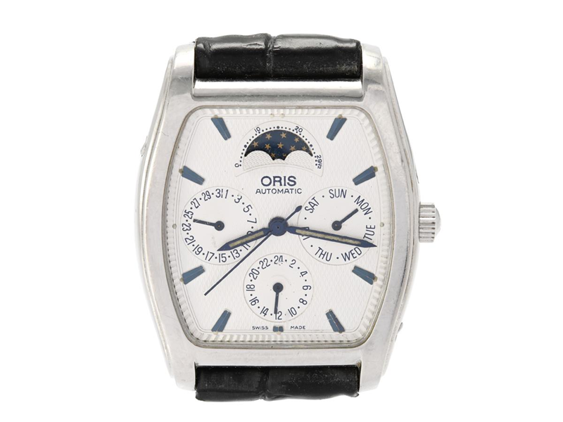 ORIS, Classic Tonneau, Cal 581 (ETA 2688), Case no. 7488, men´s wristwatch, 33 x 33,5 (41) mm, steel, self winding, sapphire crystal, day, date, moonphase, 24-hour indicator, damaged dial, leather strap, approx. 1995.