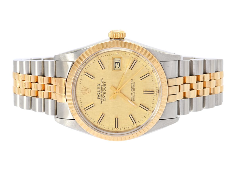 ROLEX, Oyster Perpetual, Datejust, Chronometer, Ref no. 16013, Serial no. R306484, Cal 3035, Movement no. 1947612, Case no. 16000, men´s wristwatch, 36 mm, steel/gold, self winding, plastic crystal, date, replaced hands (Luminoiva), replaced dial (T SwissT), Jubilee bracelet (damaged, see picture, replaced endlink), folding clasp, Ref no. 62523H.18-N11/455 J, approx. 1989.