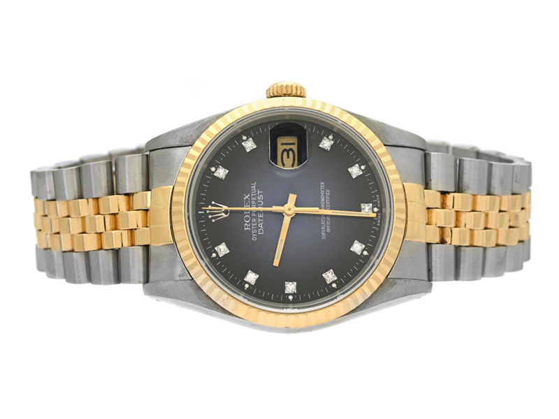 ROLEX, Oyster Perpetual, Datejust (T Swiss Made T), Chronometer, s.c. "Dégradé Diamond Dial", Ref no. 16233, Serial no. L913307, Cal 3135, Movement no. 5207562, Case no. 16200, men´s wristwatch, 36 mm, steel/gold, self winding, sapphire crystal, date, diamond dial (10 pcs. 8/8), Jubilee bracelet, folding clasp, Ref no. 62523H.18-N11/455 B, approx. 1989, box, paper box.