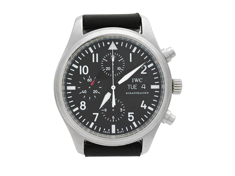 IWC, Schaffhausen, Pilot Classic, Cal 79320, Serial no. 2642591, Ref no. 3717-01, Case no. 3124856, chronograph, men´s wristwatch, 42 mm, steel, self winding, sapphire crystal, day, date, leather strap, original buckle, certificate, September 2006, box (damaged), paper box.