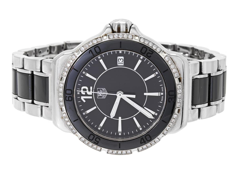 TAG HEUER, Formula 1, Serial no. EWN8846, Ref no. WAH1212.BA0859, Case no. WAH1212, ladies´ wristwatch, 34,5 mm, steel/ceramic, quartz, sapphire crystal (scratch/notches), date, brilliant bezel (60 pcs. W/I, approx. 0,34 ctw), original bracelet (steel/ceramic), folding clasp, Ref no. BA0859-G-M3, length 168 mm, approx. 2010.