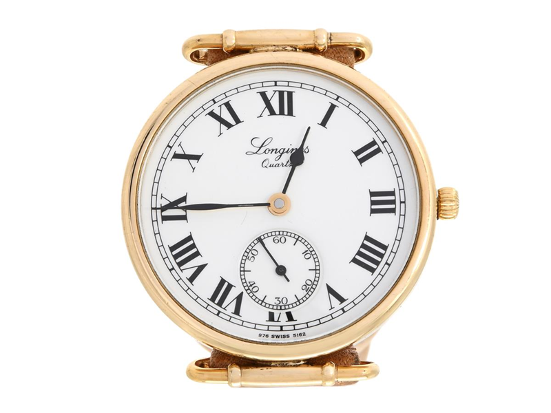 LONGINES, "150", Cal 976, Serial no. Serial no. 57461066, Case no. 5162 976 / 21980327, unisex, 30 mm, gold plated, quartz, mineral crystal, small seconds hand, fixed bar lugs, leather strap, gold plated original buckle, approx. 1982.
