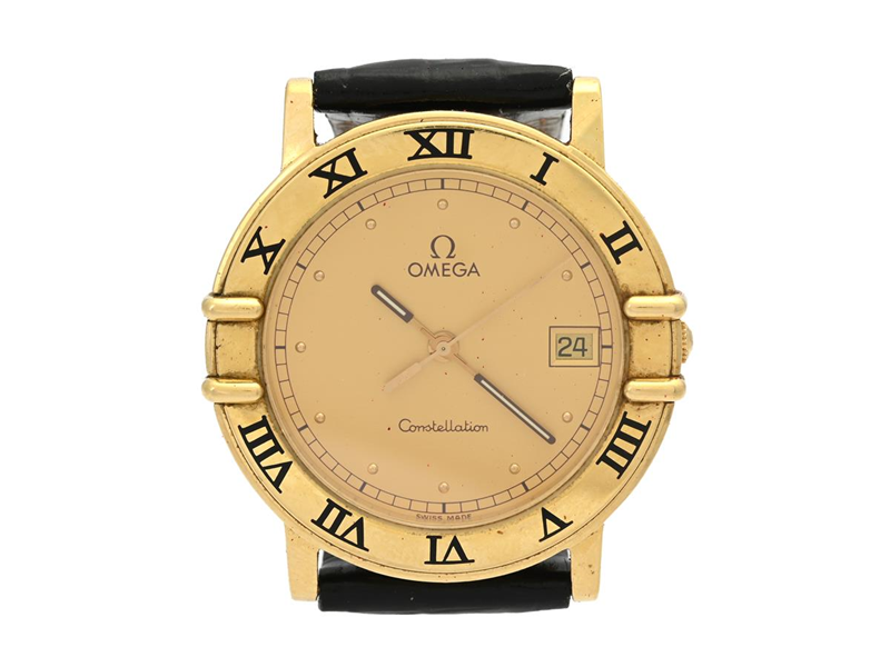 OMEGA, Constellation, Cal 1438, Serial no. 54571608, Ref no. BA 196.1080, Case no. 196.1080, men´s wristwatch, 33 mm, 18K gold, quartz, sapphire crystal, date, leather strap, original buckle in gold plated, approx. 1993, box (damaged).
