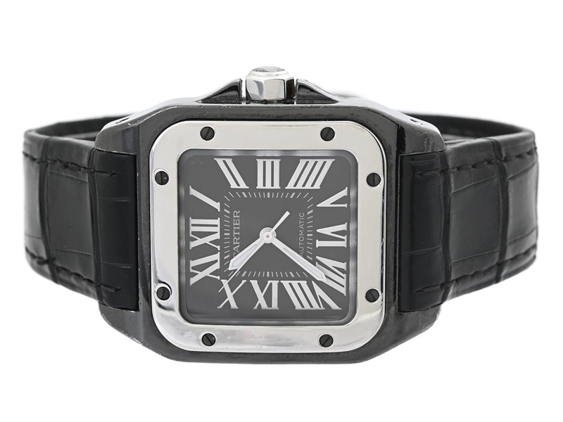 CARTIER, Santos 100, Cal 076 (ETA 2671), Ref no. W2020010, Case no. 263818NX/2878, midsize, 44,2 x 35,6 mm, steel/PVD (see pictures), self winding, sapphire crystal, swapped dial/hands, leather strap, folding clasp (steel/PVD), overhauled November 2024, approx. 2010.
