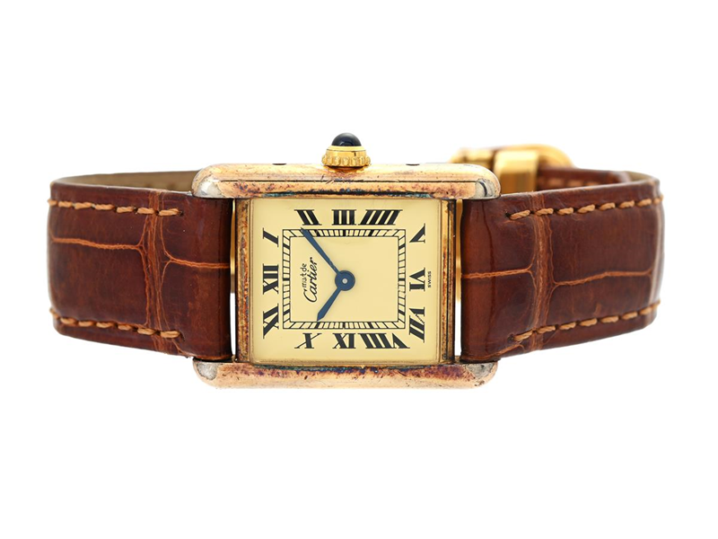 must de CARTIER, Tank, Cal 057, Case no. 1613 / CC175765, ladies´ wristwatch, 20,5 x 20 (28) mm, gilt silver (partly worn off), quartz, mineral crystal, leather strap, folding clasp (doublé), approx. 1996, box (not complete).