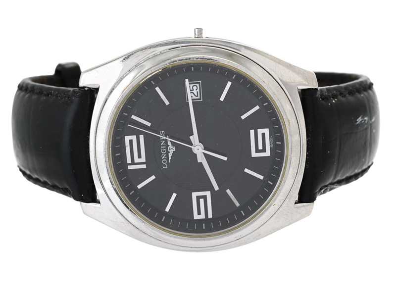 LONGINES, LungoMare, Serial no. 33215142, Case no. L3.632.4, men´s wristwatch, 39,5 mm, steel, quartz, sapphire crystal, date, defect, missing crown/setting stem, engraving, leather strap, folding clasp, approx. 2005.