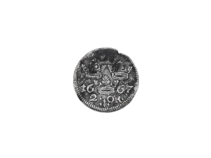 COIN, low-level silver, 2 Öre, 1667, Karl XI, diameter 20 mm, weight 1,47 g, edge damages.