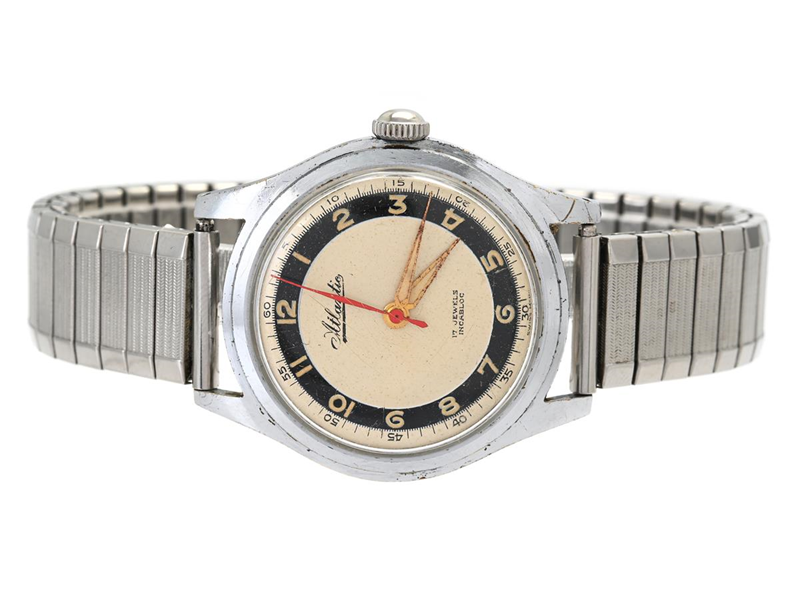 ATLANTIC, men´s wristwatch, 34 mm, Cal AS 1430, Case no. 159979, white metal, manual winding, plastic crystal, damaged dial, approx. 1950, metal bracelet not original.