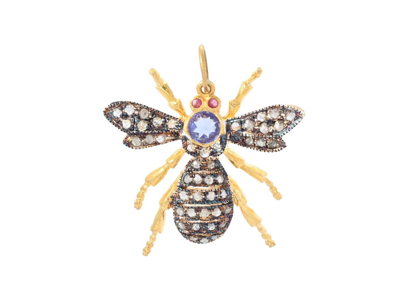 BROOCH/PENDANT, gilt sterling silver/14K gold, rose cut diamonds of lower quality, tanzanite, insect, measurements 26x24 mm, weight 2,2 g.