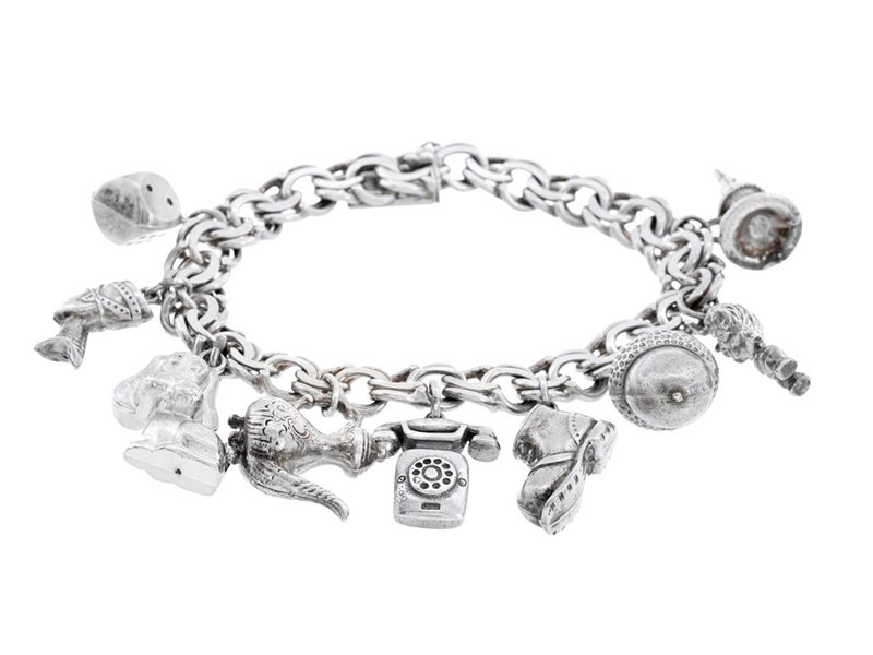 BRACELET, silver, bismarck chain, with nine charms, length approx. 18 cm, box clasp, ball missing on safety eight, weight 45,1 g.