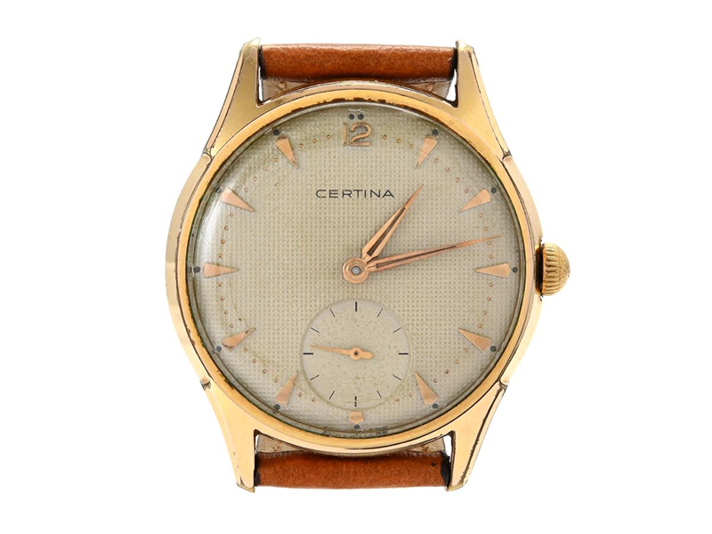 CERTINA, men´s wristwatch, 34,5 mm, Cal 320, Serial no. 2981472, Case no. 8926-4, gold plated (damaged), manual winding, plastic crystal, small seconds hand, damaged dial, leather strap, approx. 1950.
