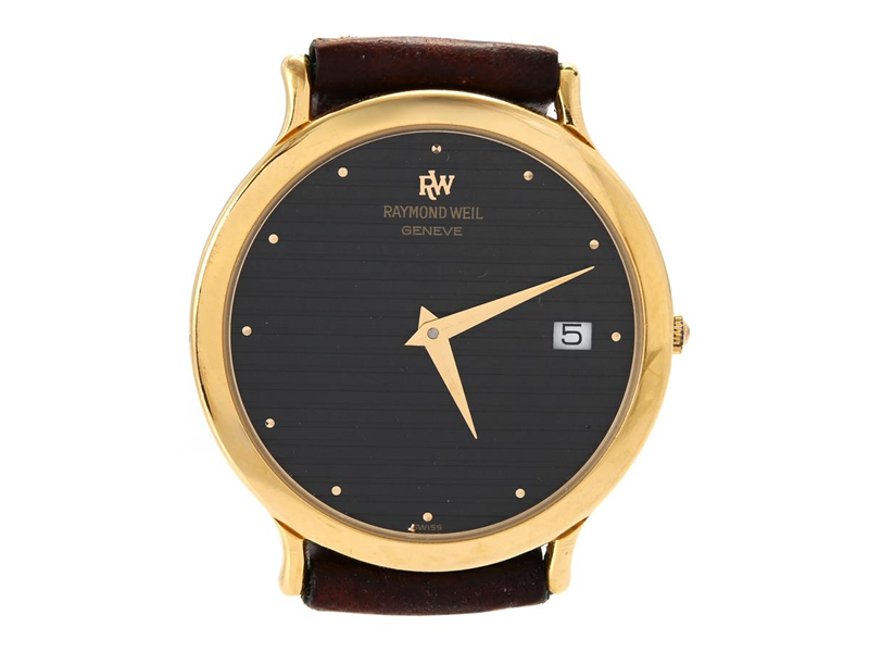 RAYMOND WEIL, Geneve, men´s wristwatch, 31,5 mm, Case no. 9120, gold plated (10 micron), quartz, mineral crystal, date, leather strap, gold plated original buckle, approx. 1990.