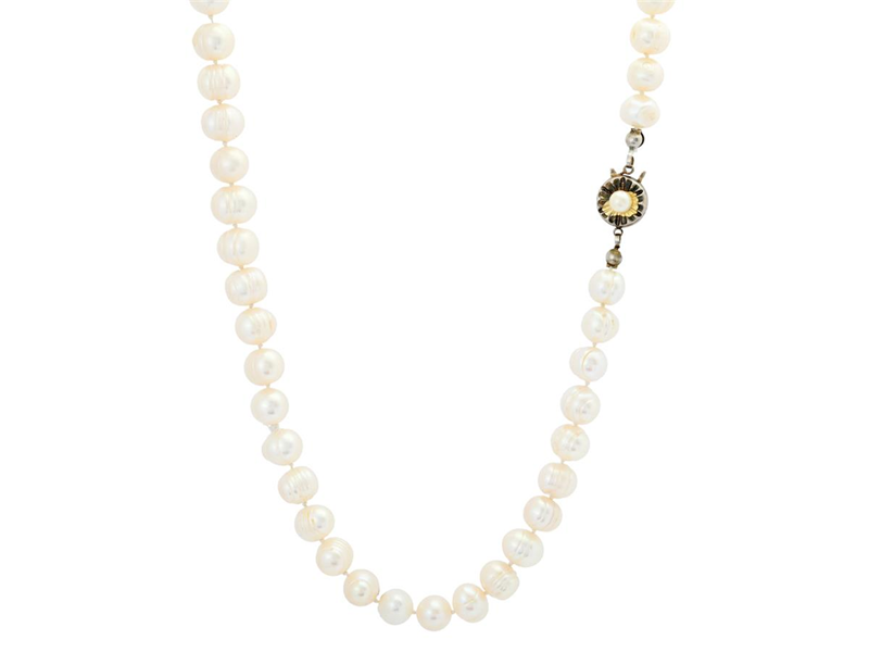 PEARL NECKLACE, cultured freshwater pearls, silver clasp with imitation pearl, length approx. 45 cm.