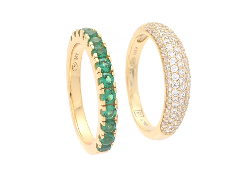 ANI JEWELS, 2 items rings, gilt sterling silver, white and green stones, size 17,75 mm, total weight 5,4 g.