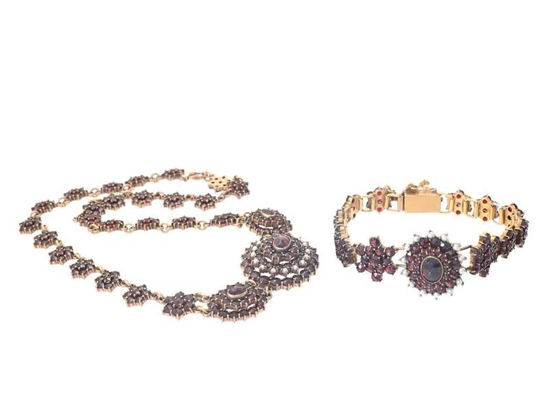JEWELLERY SET, necklace, bracelet, yellow metal, garnets, length necklace approx. 39 cm, length bracelet approx. 19 cm, weight approx. 44,5 g.