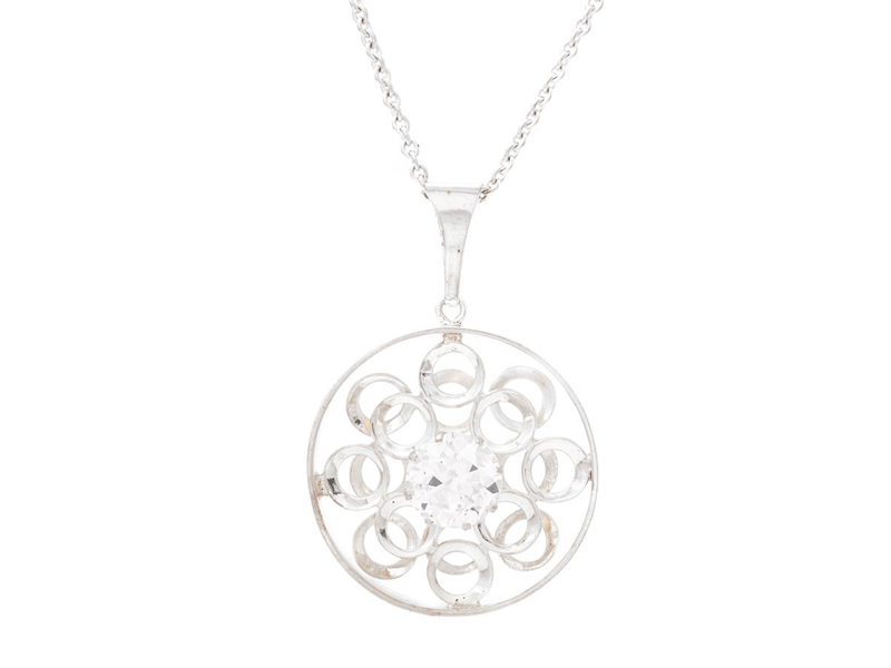 PENDANT/CHAIN, sterling silver, white stone, length pendant 4,5 cm, length chain 50 cm, bail somewhat dented, weight approx. 12,5 g.