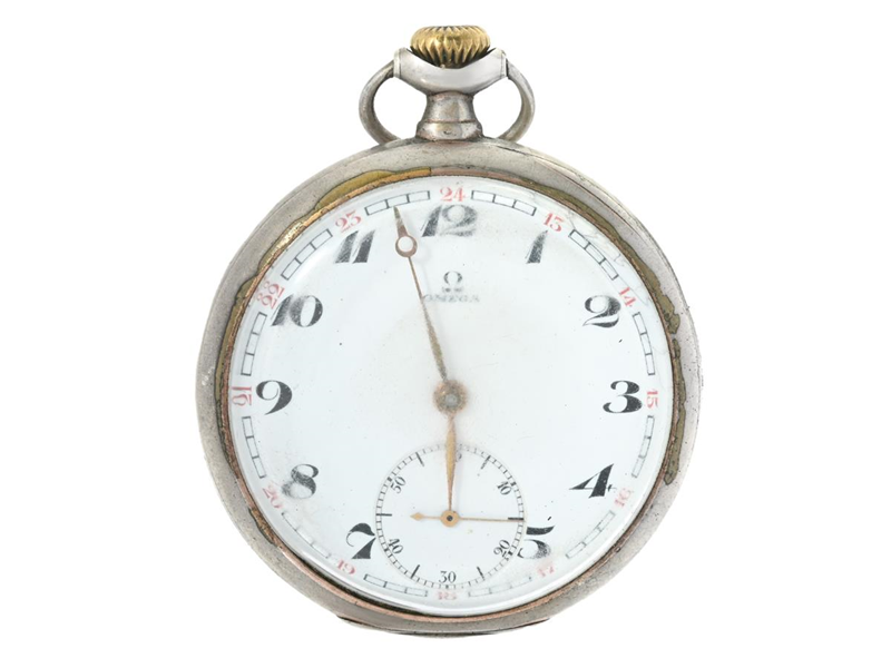 OMEGA, pocket watch, 48,5 mm, Case no. 8751133, silver (800), lever escapement, damaged dial, approx. 1934, case, chain in metal.
