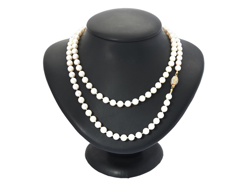 PEARL NECKLACE, cultured pearls, approx. 6,25 mm, clasp in 18K gold, diamonds approx. 0,20 ctw, length 86 cm, weight 42 g.